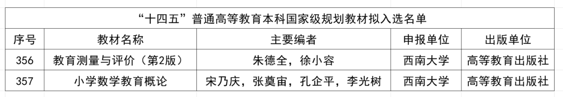 近日,教育部公布“十四五”普通高等教育本科国家级规划教材拟入选名单,基地主任朱德全教授主编的《教育测量与评价》、学术委员会主任宋乃庆教授主编的《小学数学教育概论》两部教材成功入选,充分彰显了基地在教材建设领域的深厚积淀与过硬实力。