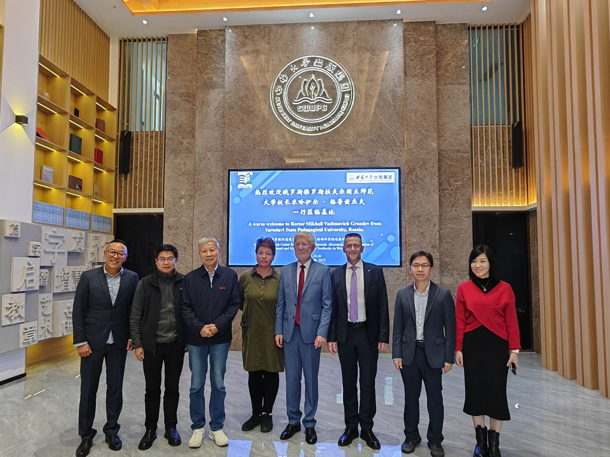 2025年10月30日,赴学校出席“2025年中俄教育类高校联盟双边理事会暨学术研讨会”的俄罗斯雅罗斯拉夫尔国立师范大学校长米哈伊尔·格鲁兹杰夫一行到访国家教材建设重点研究基地(西部职普融通教材研究)。基地学术委员会主任宋乃庆教授,西南大学出版集团党委书记、董事长,教材研究院执行院长张发钧研究员会见了俄方客人,教育学部石隆伟教授、基地执行主任范涌峰教授、基地办公室主任王宁及相关博硕士研究生等参加了此次会见。此次会见旨在深化中俄两国在教育领域的交流与合作,共同探索职普融通教材研究与发展的创新模式。